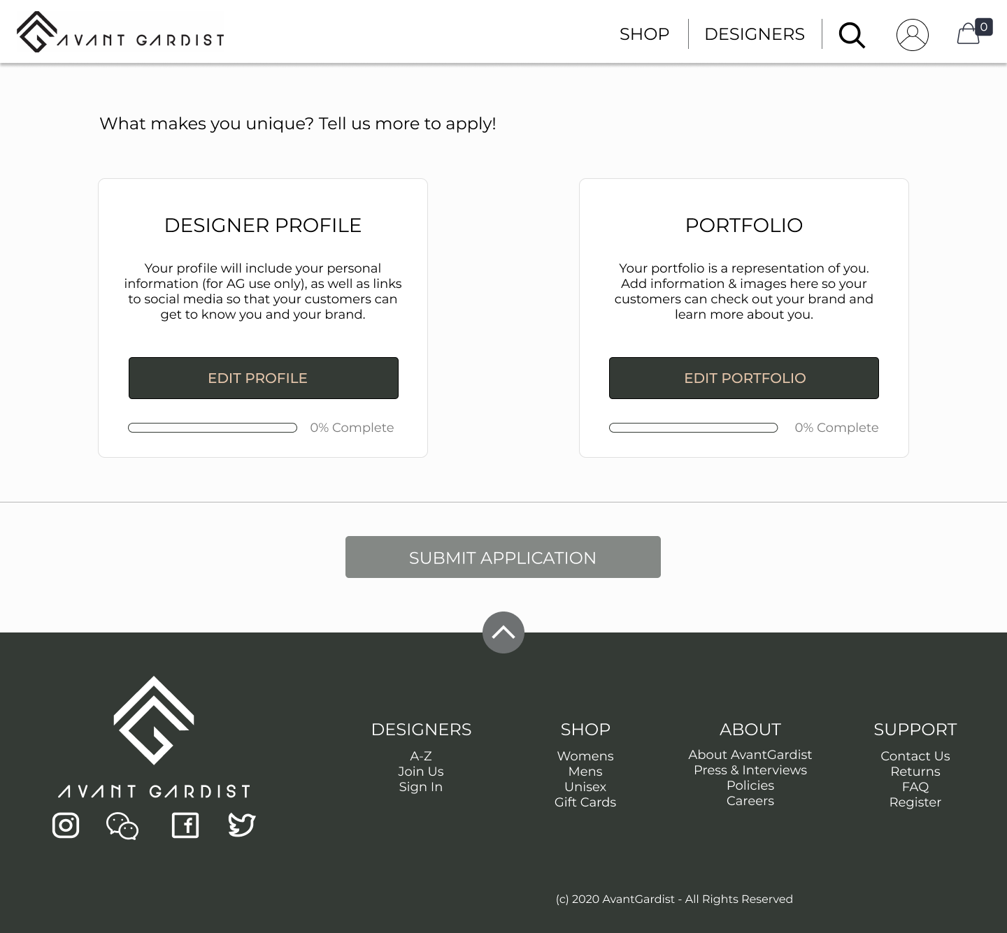 We started with a fairly ambitious scope of work, so I designed the application flow, the shop setup process, and the Avant Gardist admin dashboard that held designer applications and a feed of designer activity.