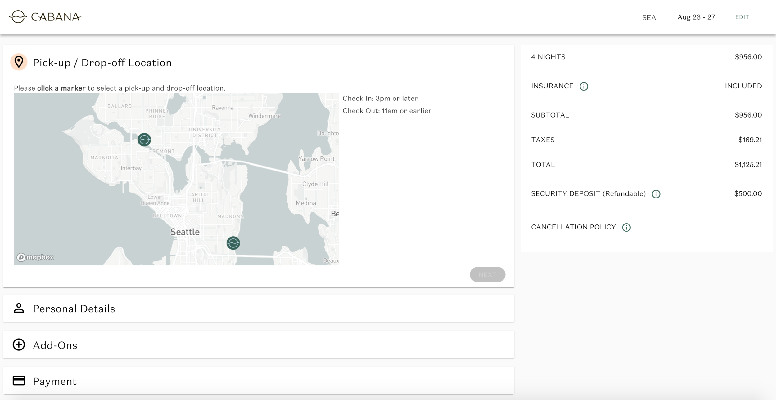 Then, after choosing their dates, we asked users to choose a pick-up location from various Cabana locations on a map. They could choose the location that was most convenient for them.
